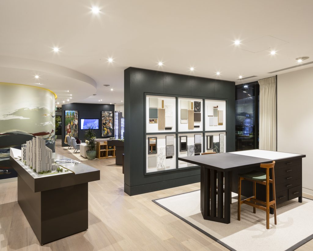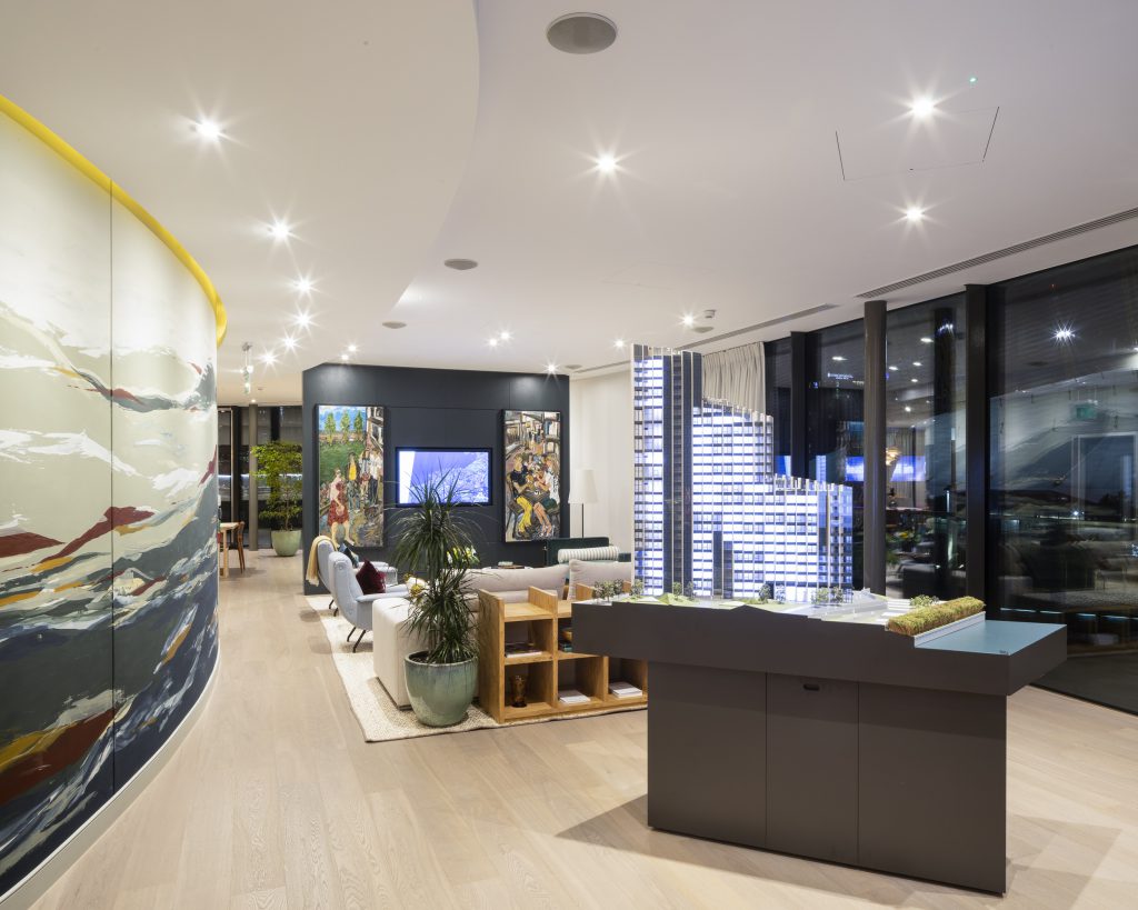 Argyll completed the fit out of the marketing suite for the two new towers, interiors designed by Studio Ashby. Creative Director Sophie Ashby specified a selection of natural materials, vibrant colours and rich fabrics. The space is full of natural light from full-height windows many providing panoramic views across London.